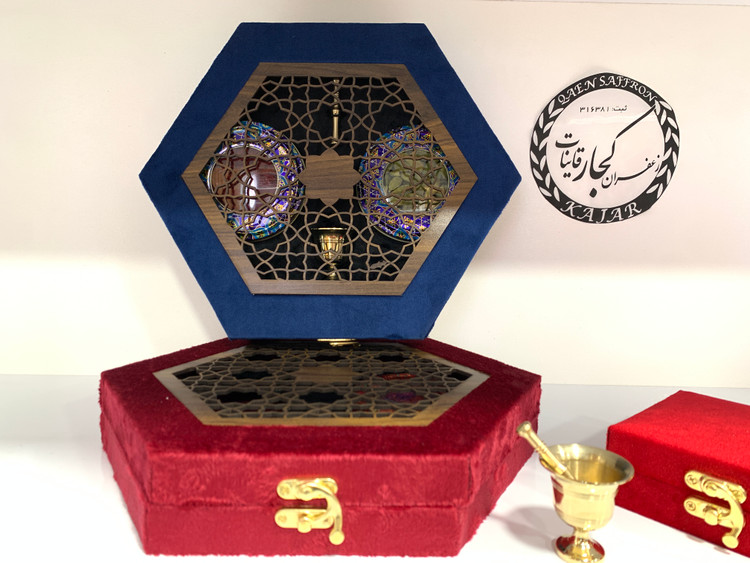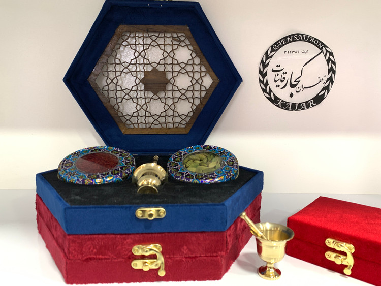 جعبه بسته بندی مخمل شامل یک ظرف فلزی با یک مثقال زعفران درجه یک قائنات ، یک عدد ظرف فلزی با 10 گرم هل اکبر یک عدد هاونگ برنجی کاربردی مخصوص می باشد.