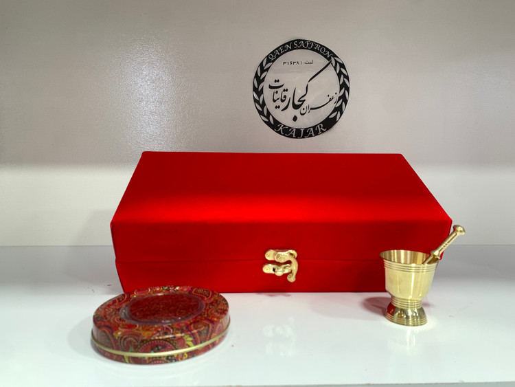 جعبه بسته بندی مخمل شامل یک ظرف خاتم با یک مثقال زعفران درجه یک قائنات یک عدد هاونگ برنجی کاربردی مخصوص و یک عدد قوری پیرکس دم آوری زعفران می باشد.