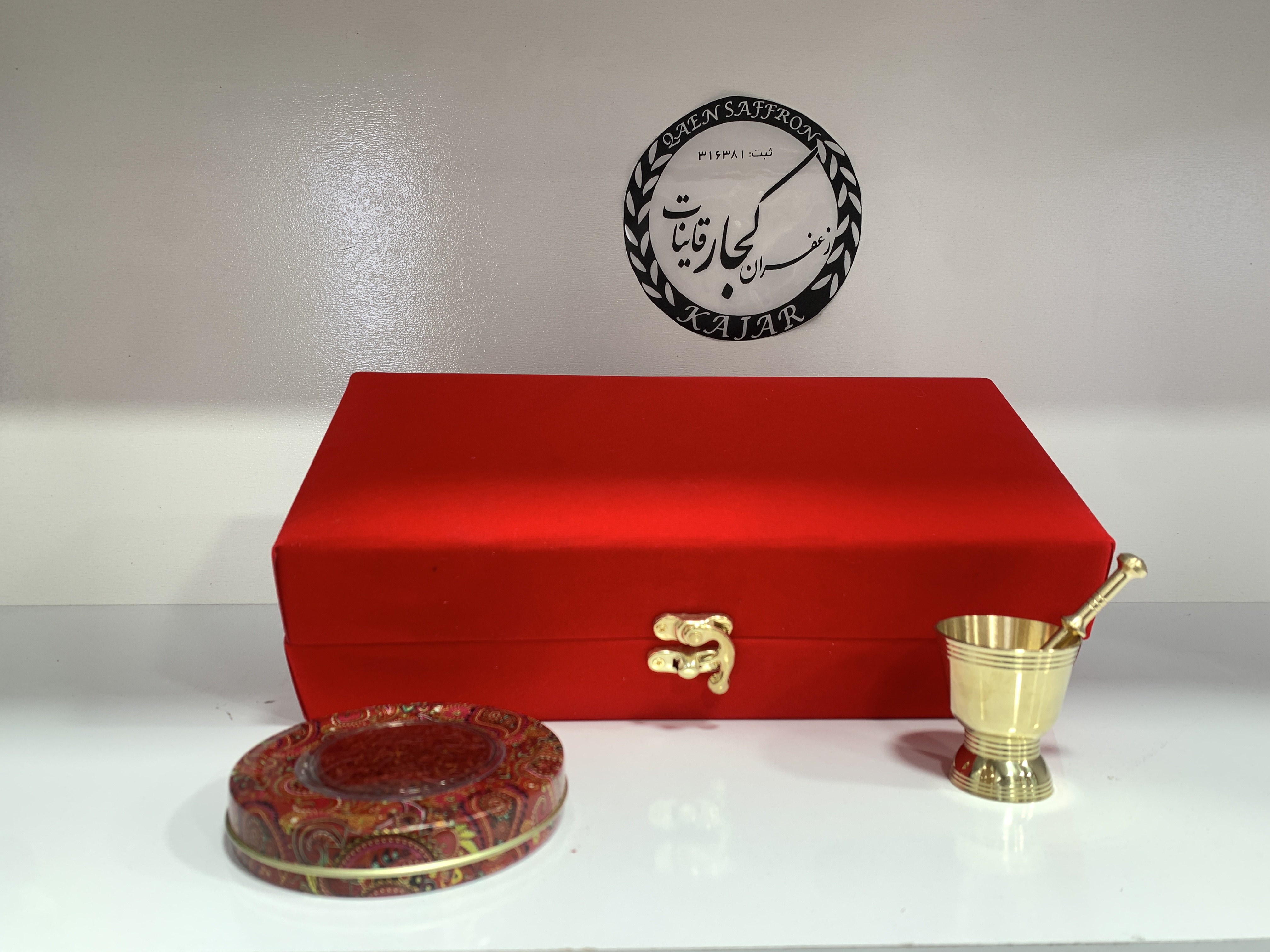 هاونگ برنجی-قوری پیرکس-یک مثقال زعفران در ظرف خاتم