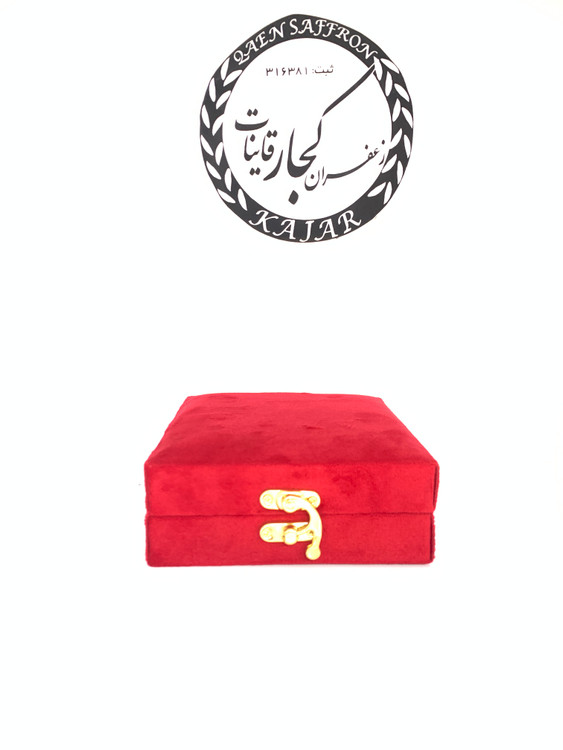 جعبه بسته بندی مخمل شامل یک ظرف خاتم با نیم مثقال زعفران درجه یک قائنات و هاونگ برنجی می باشد.