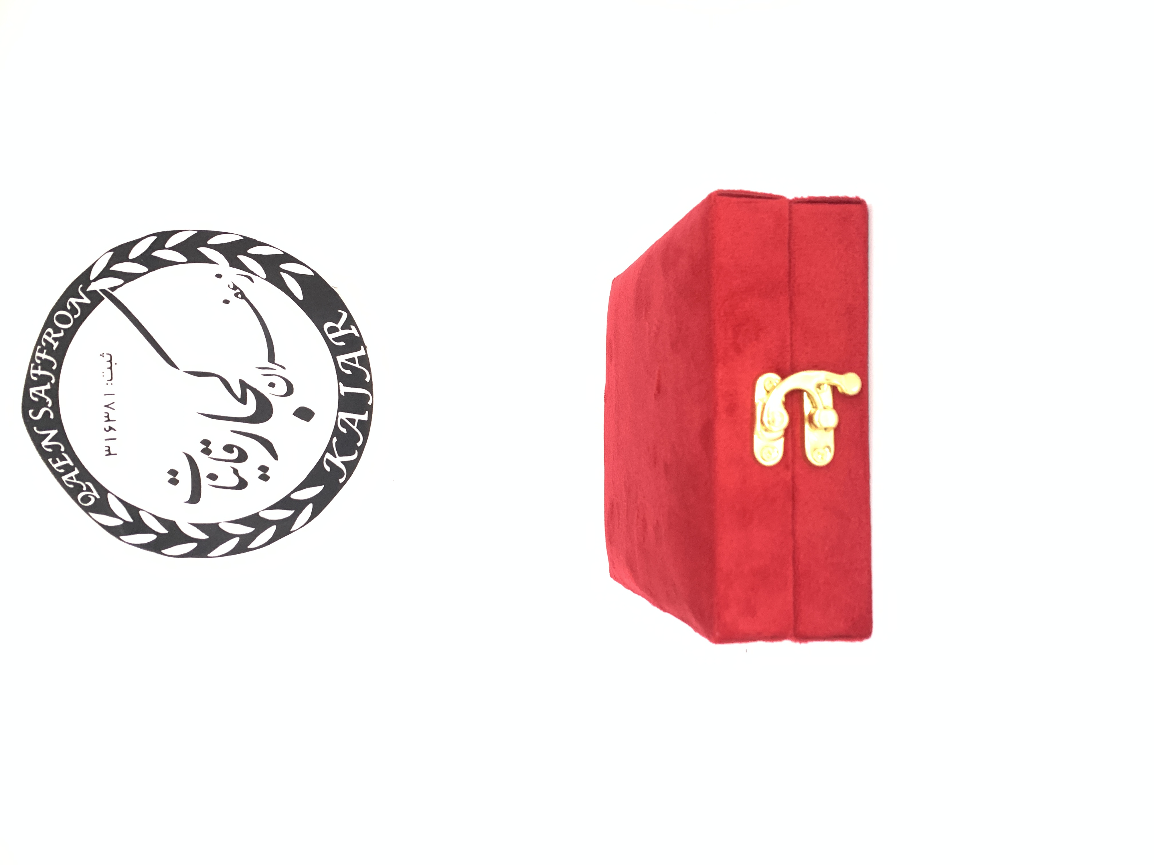 جعبه بسته بندی مخمل شامل یک ظرف خاتم با نیم مثقال زعفران درجه یک قائنات و هاونگ برنجی می باشد.