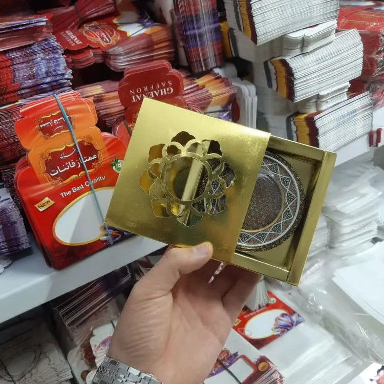 جعبه مقوایی طلایی همراه با قوطی فلزی خاتم برای بسته بندی 5 گرم(1مثقال) زعفران سرگل یا 3 گرم (نیم مثقال)زعفران نگین مناسب می باشد.